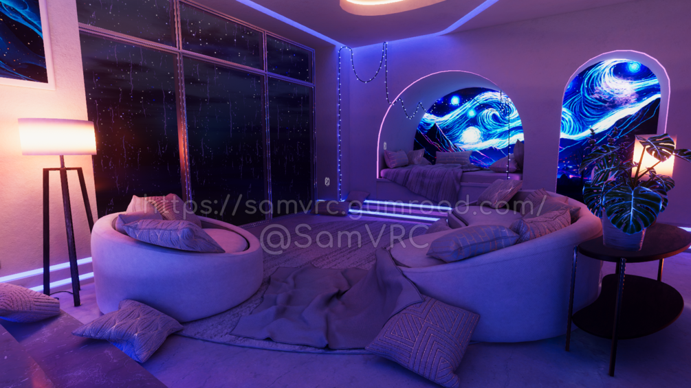 A dark modern apartment filled with blankets and relaxing spots, this is another anticipated world release from VRChat World Creators ~Sam x Camille